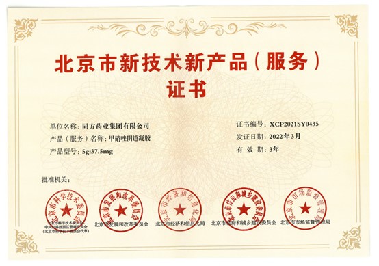 近日,我司生產(chǎn)的甲硝唑陰道凝膠榮獲北京市新技術(shù)新產(chǎn)品(服務(wù))證書(shū)。